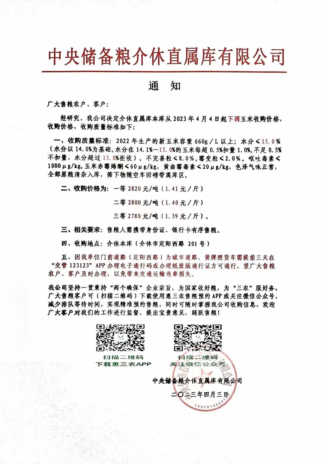 2023年4月4日中儲(chǔ)糧介休直屬庫(kù)玉米價(jià)格調(diào)整通知