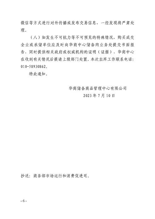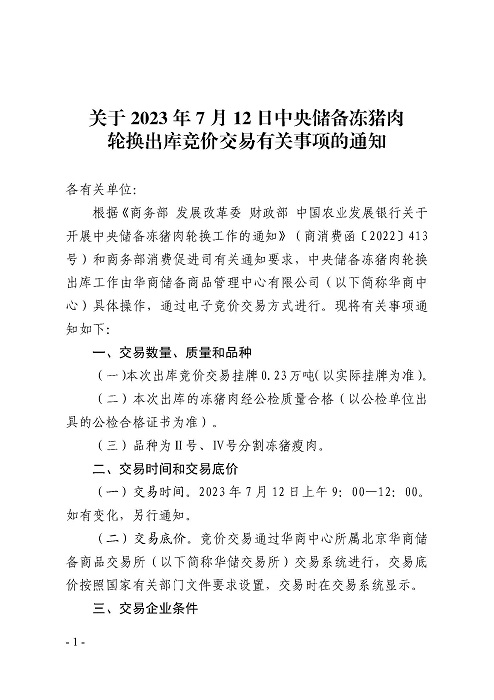 關(guān)于2023年7月12日中央儲(chǔ)備凍豬肉輪換出庫(kù)競(jìng)價(jià)交易有關(guān)事項(xiàng)的通知
