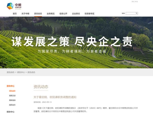 據(jù)中糧集團官網(wǎng)9月13日消息,根據(jù)《關于霍啟剛、歐陽謙職務調(diào)整的通知》(國資黨任字〔2023〕66號)精神,霍啟剛同志任中糧集團有限公司外部董事,歐陽謙同志不再擔任中糧集團有限公司外部董事職務。