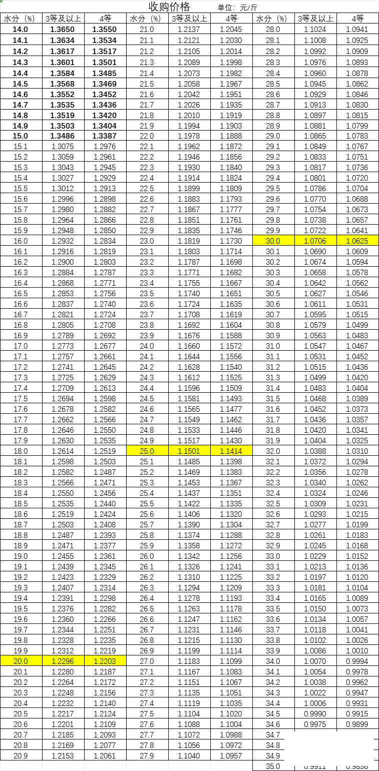 水分≤15%干糧折標(biāo)價(jià)格為2730元/噸,15%<水分≤35%潮糧折標(biāo)價(jià)格為2650元/噸。