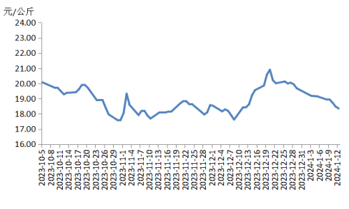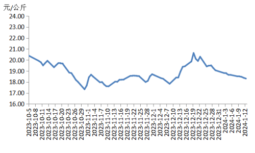 本周國內瘦肉型白條豬肉出廠價格(以下簡稱“豬肉價格”)環(huán)比下跌。周內散養(yǎng)戶和規(guī)模養(yǎng)殖場出欄生豬的積極性較高,宰后均重處于偏高水平,白條豬肉供應充裕。目前腌臘、灌香腸活動熱度下降,春節(jié)前備貨期尚未來臨,豬肉需求量偏低,白條豬肉價格下跌。