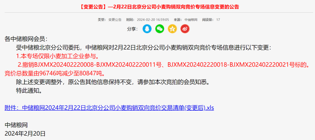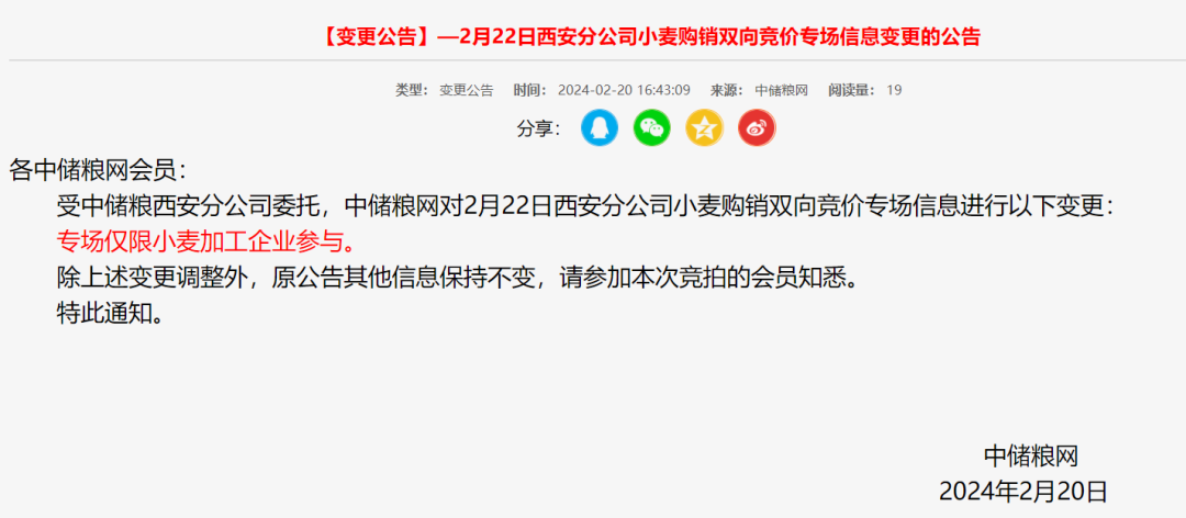 2月20日,中儲(chǔ)糧網(wǎng)發(fā)布最新消息,中儲(chǔ)糧河南分公司2月21日小麥銷售專場、山東分公司2月21日小麥銷售專場、2月22日西安分公司購銷雙向?qū)觥?月22日北京分公司購銷雙向?qū)觥?月22日湖北分公司購銷雙向?qū)龆缄懤m(xù)進(jìn)行變更:僅限小麥加工企業(yè)參與。