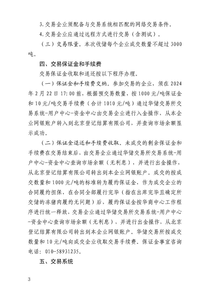 華儲網(wǎng)2月19日發(fā)布關(guān)于2024年2月23中央儲備凍豬肉輪換收儲競價交易有關(guān)事項的通知。本次收儲掛牌競價交易3萬噸,交易時間為2024年2月23日下午14:00-17:00。