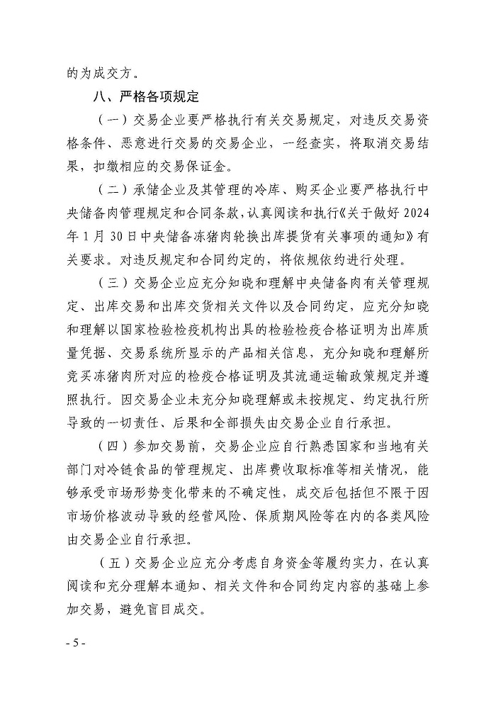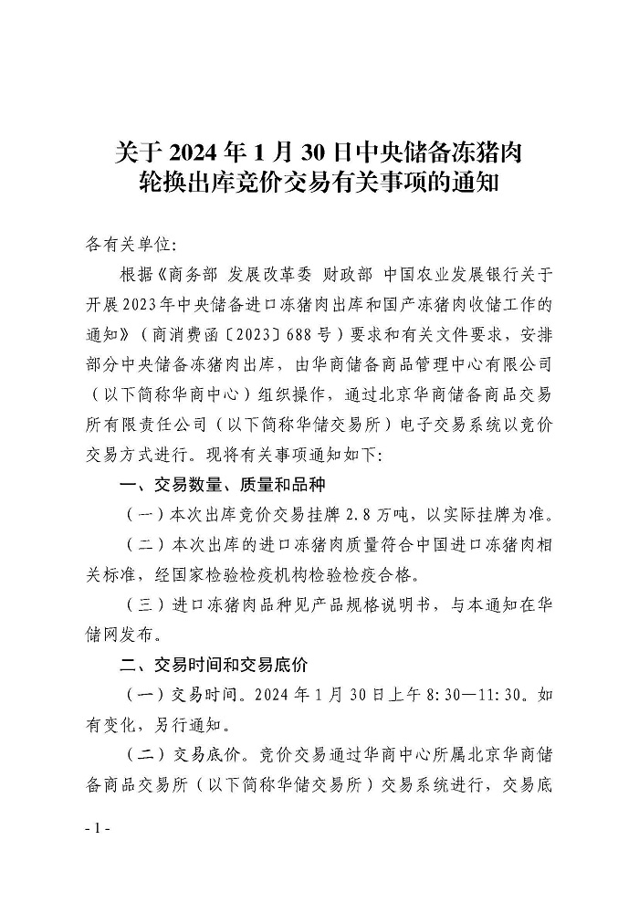 華儲(chǔ)網(wǎng)2月27日發(fā)布關(guān)于2024年2月28日和29日中央儲(chǔ)備凍豬肉輪換出庫競價(jià)交易有關(guān)事項(xiàng)的通知。本次出庫競價(jià)交易掛牌0.91萬噸,以實(shí)際掛牌為準(zhǔn)。交易時(shí)間為2024年2月28日上午8:30-11:30。如果2024年2月28日上午有未成交的標(biāo)的,則在2月29日上午對未成交的標(biāo)的重新掛牌出庫交易。