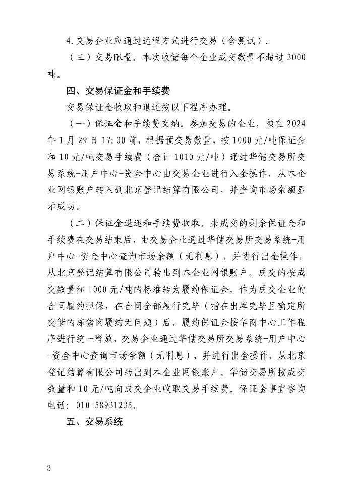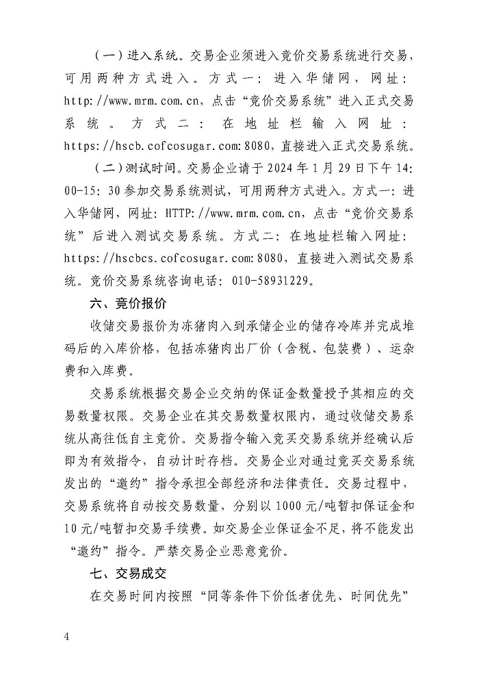 華儲(chǔ)網(wǎng)2月27日發(fā)布關(guān)于2024年2月28日和29日中央儲(chǔ)備凍豬肉輪換收儲(chǔ)競(jìng)價(jià)交易有關(guān)事項(xiàng)的通知。本次收儲(chǔ)掛牌競(jìng)價(jià)交易3.31萬(wàn)噸,交易時(shí)間為2024年2月28日下午13:30-16:30。如果2024年2月28日下午有未成交的標(biāo)的,則在2月29日下午13:30-16:30對(duì)未成交的標(biāo)的重新掛牌收儲(chǔ)交易。