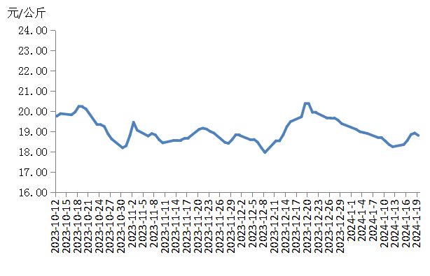 據(jù)農(nóng)業(yè)農(nóng)村部信息中心和山東卓創(chuàng)資訊股份有限公司聯(lián)合監(jiān)測,2024年第3周(即2024年1月15日-1月19日,以下簡稱本周),16省(直轄市)瘦肉型白條豬肉出廠價(jià)格總指數(shù)的周平均值為每公斤18.69元,環(huán)比上漲1.1%,同比下跌9.4%,較上周擴(kuò)大3.4個(gè)百分點(diǎn)。