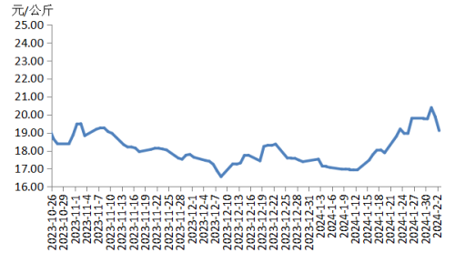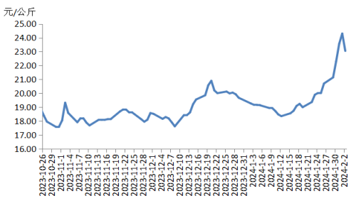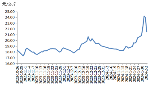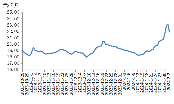 本周?chē)?guó)內(nèi)瘦肉型白條豬肉出廠(chǎng)價(jià)格(以下簡(jiǎn)稱(chēng)“豬肉價(jià)格”)環(huán)比大幅上漲,主要是因?yàn)榫植康貐^(qū)雨雪天氣不利于生豬出欄,加之部分散養(yǎng)戶(hù)存壓欄惜售,致使生豬及豬肉供應(yīng)短時(shí)收緊。同時(shí),隨小年、春節(jié)等節(jié)慶臨近,終端需求提升,部分豬肉貿(mào)易商看漲年前行情而提高拿貨積極性,促使白條豬肉銷(xiāo)售速度加快,價(jià)格大幅上漲,僅周末時(shí)因小年備貨期結(jié)束,消費(fèi)者對(duì)高價(jià)貨源的采購(gòu)能力有所減弱,豬肉價(jià)格小幅回落。