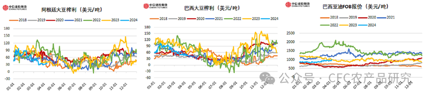 2.美豆油(7728, 34.00, 0.44%)價格強勢,支撐巴西國內(nèi)大豆(4794, 8.00, 0.17%)榨利,進而形成了巴西內(nèi)陸大豆壓榨廠收購價格高于出口商給出的內(nèi)陸收購價,因此賣壓并未壓低CNF價格。