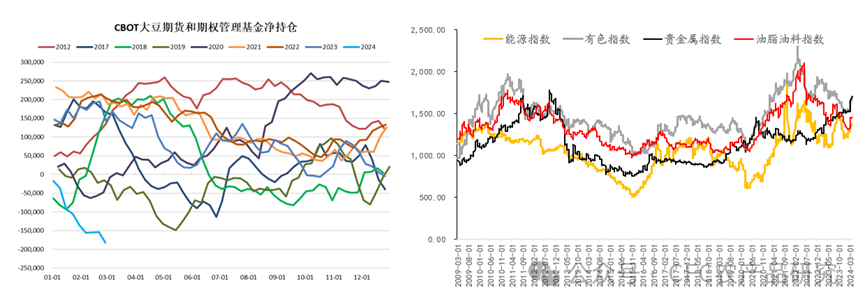 遠期價格結構也暗示南美的CNF上行空間有限,但更值得言說的是,新季種植面積的不及預期基本就暗示過剩定價的階段性結束,后期在沒有進一步利空的情況下,基金空頭逐步開啟減持,而后用經(jīng)典的“天氣升水”敘事賦予價格上行以合法性,此間來自于資源品牛市帶來的風險偏好溢出,有望實現(xiàn)多頭預期漣漪型擴散逐步填平商品估值洼地,畢竟CBOT大豆的相對定價有些偏低了。