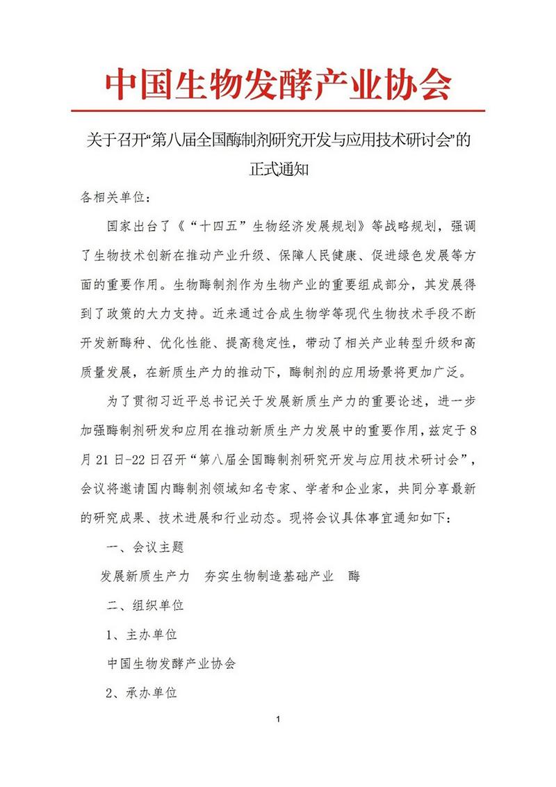 關(guān)于召開“第八屆全國(guó)酶制劑研究開發(fā)與應(yīng)用技術(shù)研討會(huì)”的正式通知