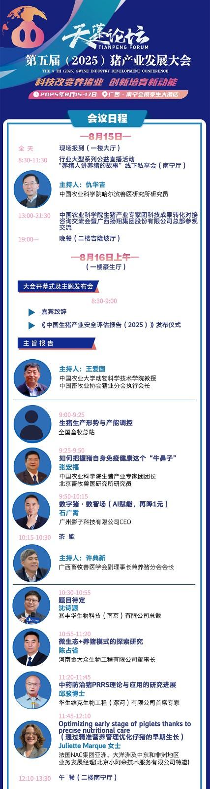 論壇已成功舉辦四屆,我們將充分利用天蓬論壇—豬產(chǎn)業(yè)發(fā)展大會這一平臺的賦能賦智作用,研判行業(yè)態(tài)勢,展示前沿成果,增進(jìn)產(chǎn)業(yè)對接,促進(jìn)成果轉(zhuǎn)化,推動生豬種業(yè)創(chuàng)新、健康養(yǎng)殖、數(shù)字轉(zhuǎn)型和綠色發(fā)展,加快培育和形成生豬產(chǎn)業(yè)新質(zhì)生產(chǎn)力,為生豬產(chǎn)業(yè)高質(zhì)量發(fā)展貢獻(xiàn)更多力量。茲定于2025年8月15-17日在廣西南寧會展豪生大酒店舉辦“天蓬論壇--第五屆(2025)豬產(chǎn)業(yè)發(fā)展大會”。我們熱忱歡迎各位行業(yè)同仁蒞臨本次大會!現(xiàn)將大會通知如下:
