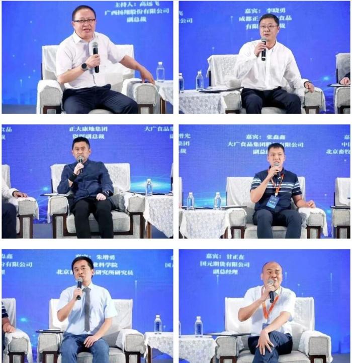 (從左至右、從上至下依次為:廣西揚(yáng)翔股份有限公司副總裁高遠(yuǎn)飛,成都正大農(nóng)牧食品有限公司總裁李曉勇,正大康地集團(tuán)資深副總裁丁增光,大廣食品集團(tuán)股份有限公司副總經(jīng)理張淼鑫,農(nóng)業(yè)農(nóng)村部豬肉全產(chǎn)業(yè)鏈監(jiān)測(cè)預(yù)警首席分析師、中國(guó)農(nóng)業(yè)科學(xué)院北京畜牧獸醫(yī)研究所研究員朱增勇,國(guó)元期貨有限公司副總經(jīng)理甘正在)